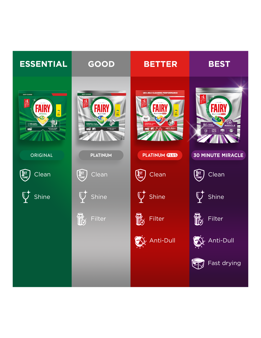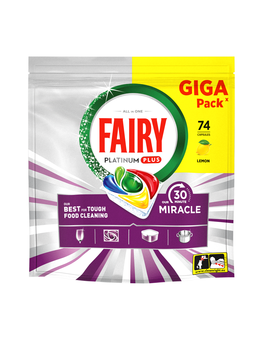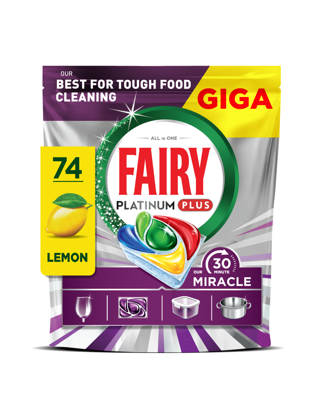 SINU IMELINE KÕIK-ÜHES LAHENDUS LIHTSALT SÄRAVATEKS NÕUDEKS. Avasta Fairy Our 30 Minute Miracle Platinum Plus, meie Nr 1 lahendus tõrksate toidujääkide eemaldamiseks. Need imelised kõik-ühes nõudepesumasina tabletid saavutavad vaevata laitmatu tulemuse isegi lühima pesutsükliga ja jätavad nõudele kerge sidrunilõhna. Viie geeli tõhusus annab säravpuhtad nõud, superläike, kiire kuivamise, rasvase filtri puhastamise ja Tuhmumisvastase Tehnoloogia. Selle kolmekordse toimega rasvaeemaldusained (võrreldes tootega Fairy Original All-in-One) eemaldavad tõrksad toidujäägid kõigest 30 minutiga. Fairy toimib nii pika kui ka lühikese pesutsükliga juba esimesel korral ning eelpesu või järelpesu pole vajalik. Just nagu Fairy nõudepesuvedelik, kuid mugava tableti kujul. Need nõudepesumasina tabletid kõrvaldavad vajaduse kasutada nõudepesumasina soola või nõudepesumasina loputusvahendit. Sobib suurepäraselt hõivatud kodudesse ning pakub kiiret ja laitmatut puhastust, millel on üleöö leotamise toime. Koge Imet ja tervita säravaid tulemusi Fairy 5-kordse puhastusvõimsusega.
