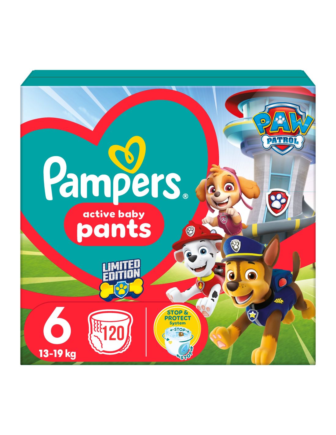 Avasta eritoode Pampers Pants Paw Patrol Püksmähkmed! Pampers Pants Paw Patrol disainiga püksmähkmetel on uuenduslik STOP & PROTECT POCKET kaitsetasku, mis kombineerituna mähkmete 360° mugava sobivusega tagab kuni 12-tunnise lekkekaitse.