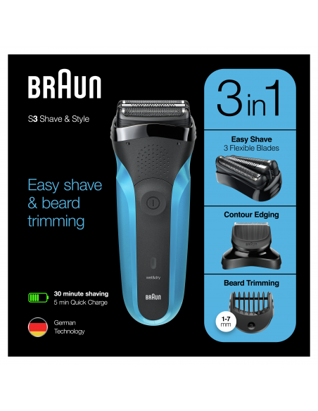 Braun Series 3 Shave&Style 310BT, kolm-ühes Wet&Dry pardel täpse piiramistera ja viie kammiga.