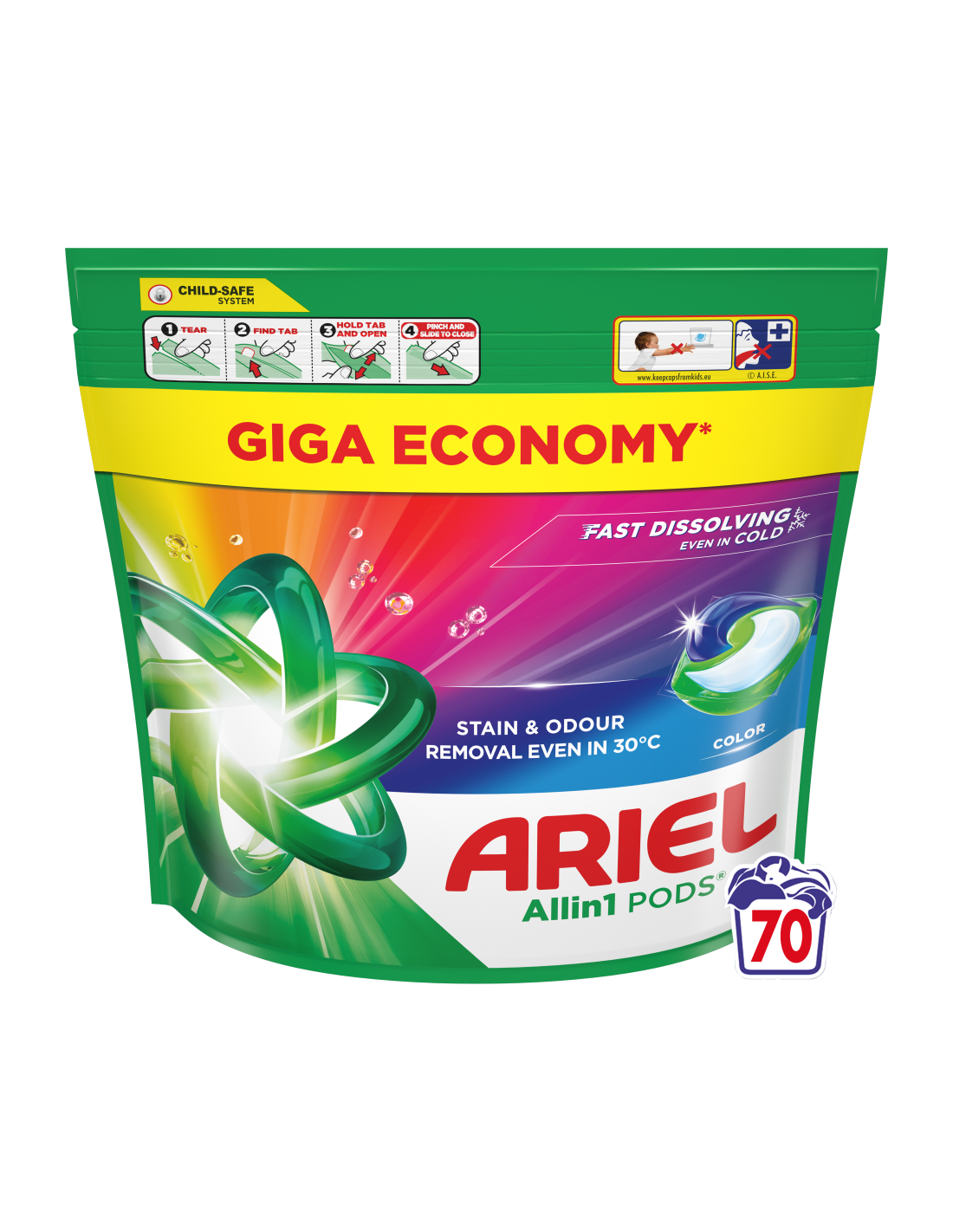 Whirlpooli, Electroluxi, Candy ja Beko soovitatud kaubamärk Ariel esitleb Arieli Allin1 PODS pesutablettides pesupesemisvahendit Color, mis eemaldab raskestieemaldatavad plekid ja ebameeldivad lõhnad isegi 30°C juures. Need on loodud toimima suurepäraselt ka külmemates tsüklites, lahustuvad kiiresti isegi külmas vees ja tagavad laitmatud tulemused. HOIATUS: toode võib olla kahjulik ja põhjustada raske vigastuse. Ariel Allin1 PODS pesukapslites pesuvahendit tuleb alati hoida lastele kättesaamatus kohas. Lisateavet leiad aadressilt keepcapsfromkids.eu.
