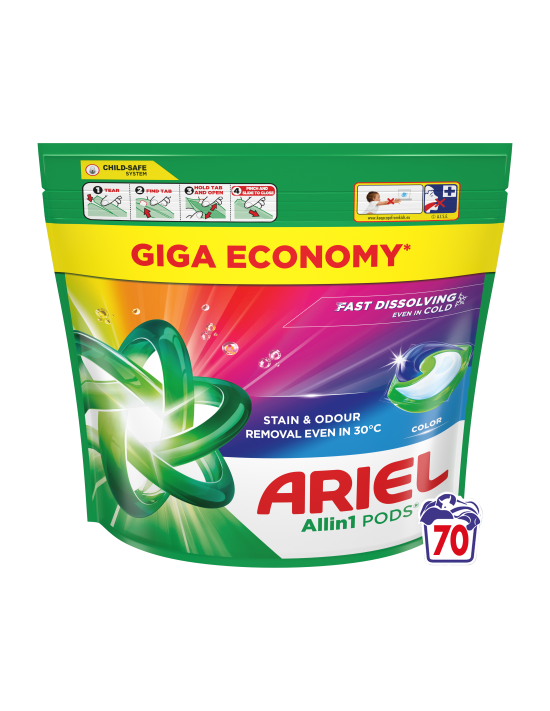 Whirlpooli, Electroluxi, Candy ja Beko soovitatud kaubamärk Ariel esitleb Arieli Allin1 PODS pesutablettides pesupesemisvahendit Color, mis eemaldab raskestieemaldatavad plekid ja ebameeldivad lõhnad isegi 30°C juures. Need on loodud toimima suurepäraselt ka külmemates tsüklites, lahustuvad kiiresti isegi külmas vees ja tagavad laitmatud tulemused. HOIATUS: toode võib olla kahjulik ja põhjustada raske vigastuse. Ariel Allin1 PODS pesukapslites pesuvahendit tuleb alati hoida lastele kättesaamatus kohas. Lisateavet leiad aadressilt keepcapsfromkids.eu.