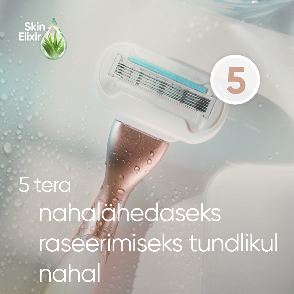 - 5 TERAGA RASEERIJA: ülimalt nahalähedane raseerimine vaid ühe tõmbega ja siledus kuni 30 päevaks.