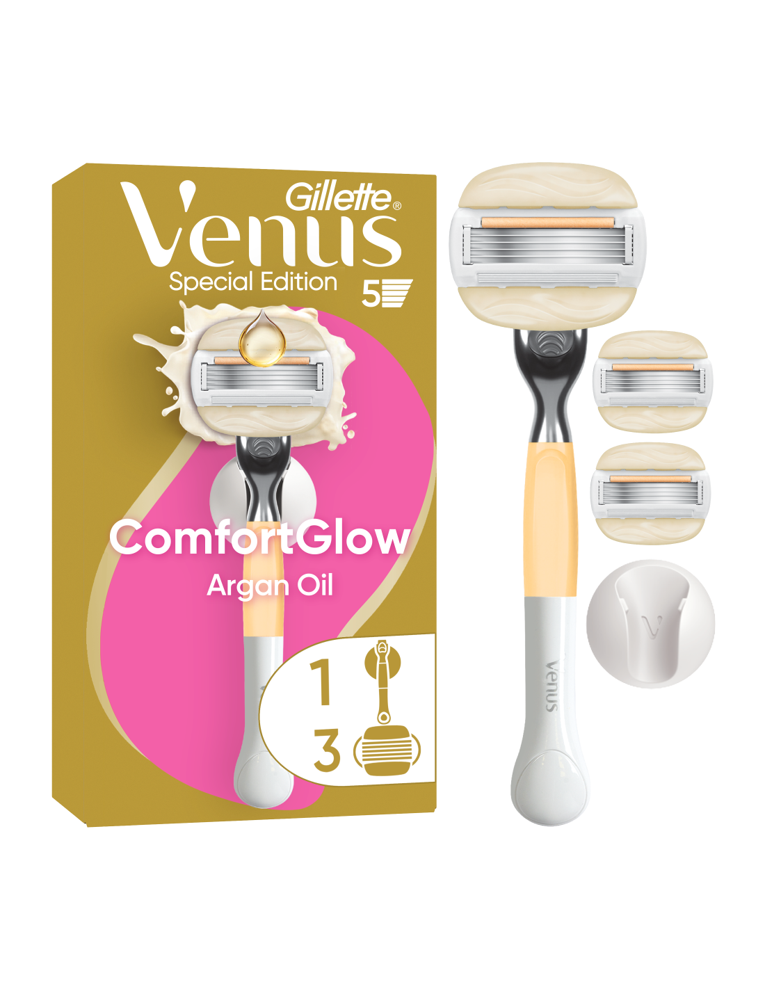 - SILE JA PEHME: Gillette Venus Comfort Glow veidikese Argaaniaõliga Naiste Raseerija muudab naha ühe tõmbega silmnähtavalt siledaks ja pehmeks ning on spetsiaalselt loodud kuivale nahale.