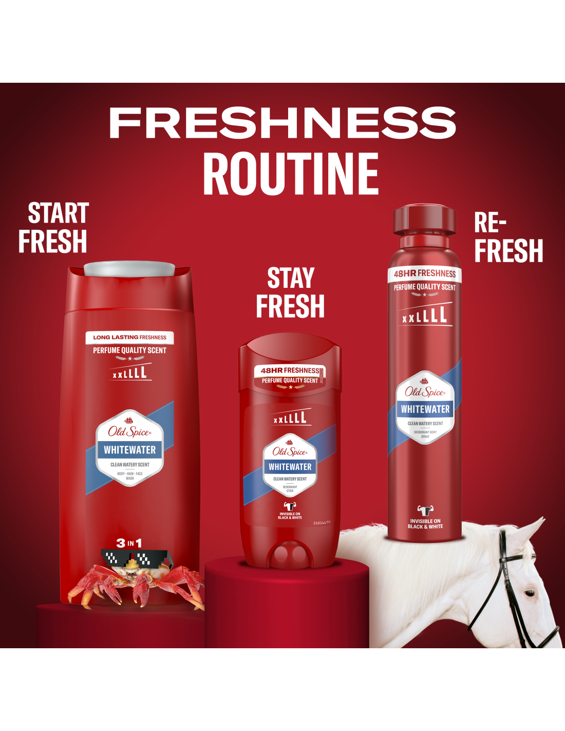 - Old Spice Whitewateri rikkalik ambra-, sandlipuu- ja tsitruselõhn muudab sind unustamatuks, nii et sinust saab põhimõtteliselt maailma naba.