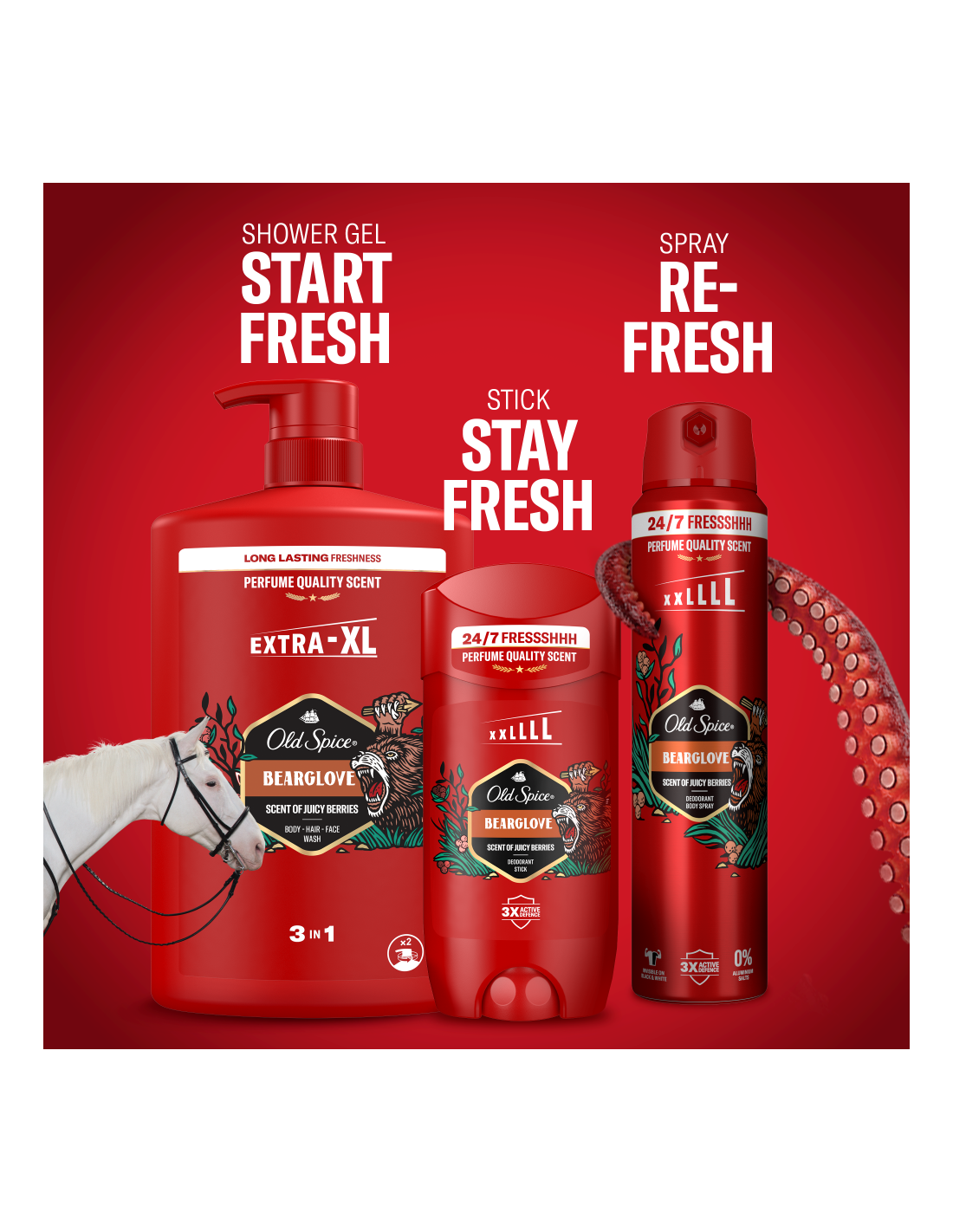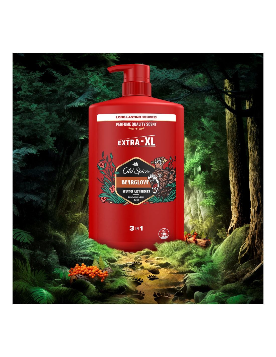 OLD SPICE Bearglove dušigeel annab juustele läike ja pehmuse ning niisutab meeldivalt nahka ja nägu. Sügavpuhastav koostis sisaldab mahlaste marjade, hapuka tsitruse ja õrna õuna aroomi koos vürtsikate nootidega. Jätab naha vastupandamatult pehmeks, siledaks ja värskeks. OLD SPICE Bearglove dušigeel on mõeldud meestele, kellel on normaalne nahk.