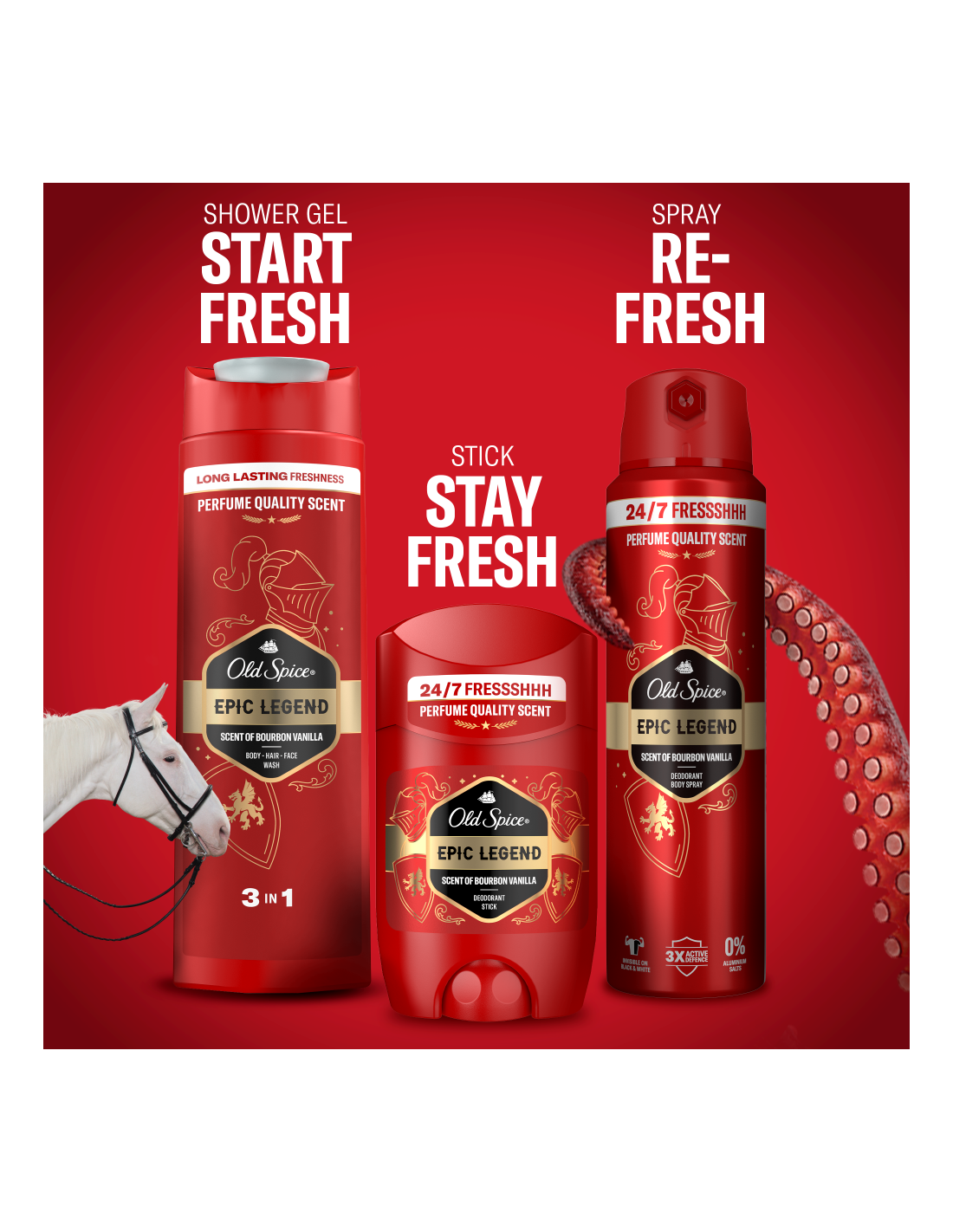 Naudi unustamatut kauakestvat värskust ja heast lõhnast tulevat enesekindlust tänu meestele mõeldud dušigeelile ja šampoonile Old Spice Epic. Sügavpuhastava koostise ja parfüümikvaliteediga aroomiga eemaldab see mustuse ja ebameeldiva lõhna, jättes sind värskeks ja puhtaks. Universaalne kolm-ühes koostis toimib juustel, näol ja kehal, jättes naha vastupandamatult siledaks, nii et saad keskenduda tähtsamatele tegevustele, nagu kasulike kokkulepete sõlmimine või delfiinide rääkima õpetamine. Bourboni vanilje, kirsitubaka, suitsutatud tammepuidu ja sooja ambra lõhn muudab sind tõeliseks värskuse rüütliks.