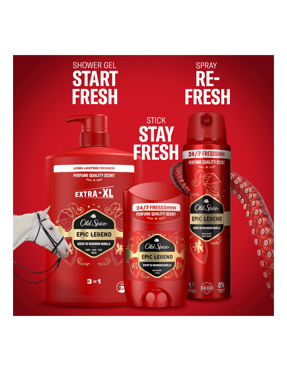 Naudi unustamatut kauakestvat värskust ja heast lõhnast tulevat enesekindlust tänu meestele mõeldud dušigeelile ja šampoonile Old Spice Epic. Sügavpuhastava koostise ja parfüümikvaliteediga aroomiga eemaldab see mustuse ja ebameeldiva lõhna, jättes sind värskeks ja puhtaks. Universaalne kolm-ühes koostis toimib juustel, näol ja kehal, jättes naha vastupandamatult siledaks, nii et saad keskenduda tähtsamatele tegevustele, nagu kasulike kokkulepete sõlmimine või delfiinide rääkima õpetamine. Bourboni vanilje, kirsitubaka, suitsutatud tammepuidu ja sooja ambra lõhn muudab sind tõeliseks värskuse rüütliks.