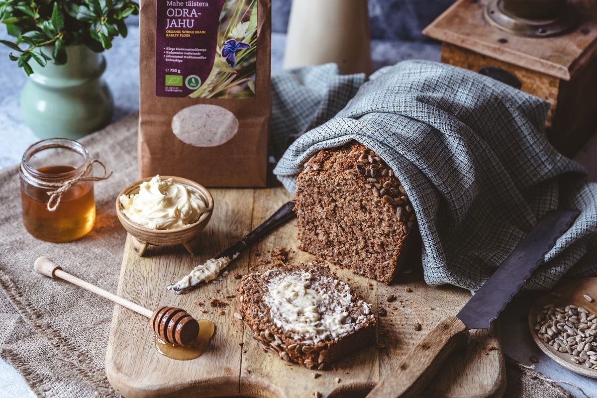 Imeliselt pehme sisuga ja päevalilleseemnete krõmpsuga odrakarask on eriti maitsev otse ahjust võetuna,