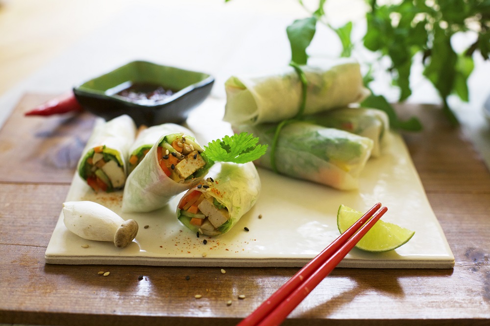 Viiluta ka avokaado ning haki koriander ja murulauk. Tükelda tofu ja seened ning pruunista õlis. Et riisipaber muutuks pehmeks, tuleb seda vees leotada. Valmista riisipaberid ette pakendil olevate juhiste järgi. Kui riisipaber on täiesti pehme, siis kuivata see ning aseta lõikelauale.