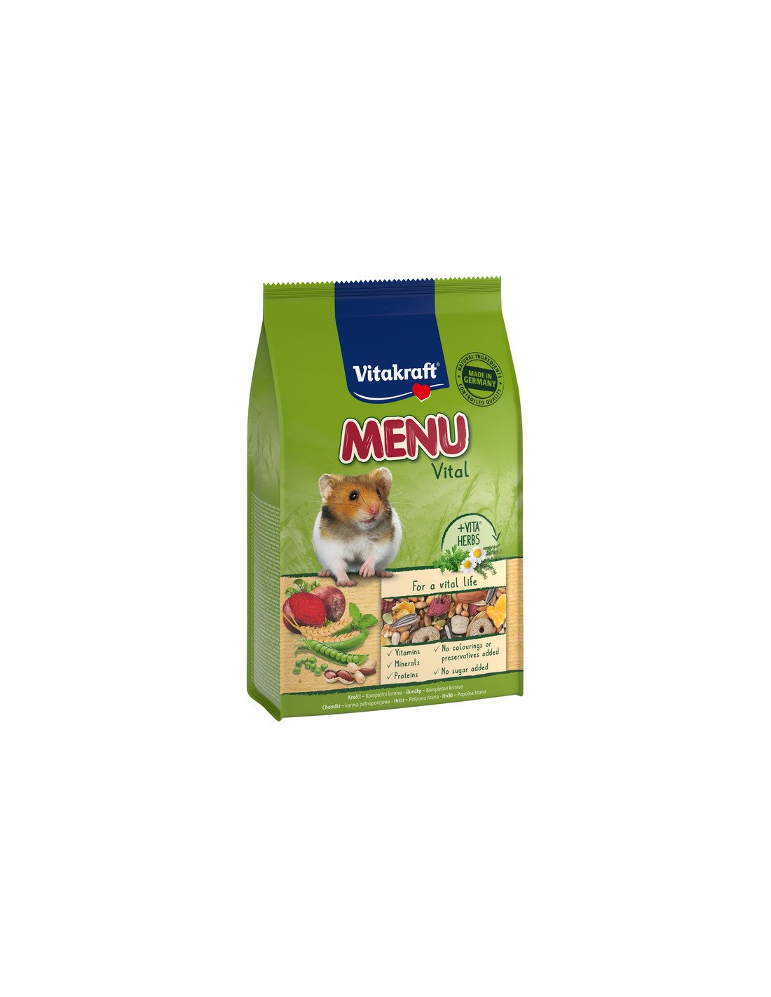 Vitakraft MENU Vitali segud sisaldavad maitsvaid köögivilju ja puuviljaseid puuvilju. Rikastatud VITA®HERBS hoolikalt valitud ürtidega, mitte ainult ei maitse teie närilistele eriti hästi, vaid pakuvad neile ka kõike, mida nad tervislikuks eluks vajavad.