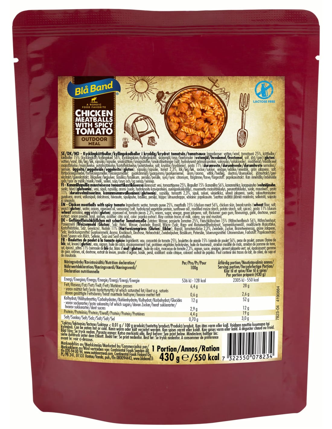 keedetud pasta 33% (vesi, durum-nisujahu (gluteen), munavalge), tomatipüree 25%, kanapallid 15% (kanaliha 10%, sibul, riivsai (nisujahu (gluteen), sool, pärm), nisugluteen, nisutärklis (gluteen), vesi, rapsiõli, jodeeritud sool (sool, kaaliumjodaat), vürtsid, dekstroos), rapsiõli, tomatitükid 2,3%, sibul, suhkur, äädikas, roheline jalapeno 0,6%, sool, paksendaja: guarkummi, lõhna- ja maitseained, küüslaugupulber, dekstroos, basiilik, petersell, sibulapulber, pärmiekstrakt, hape: sidrunhape, värvaine: paprikaekstrakt. Võib sisaldada piima, selleri, soja ja sinepi osakesi. Laktoosivaba.